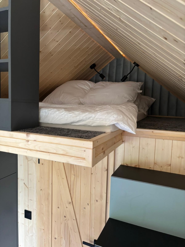 - Gemütliches Schlafloft unter dem Dach mit bequemen Betten und stimmungsvoller Beleuchtung