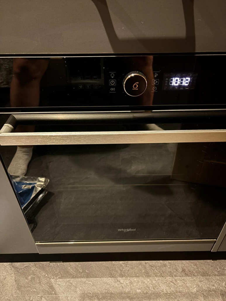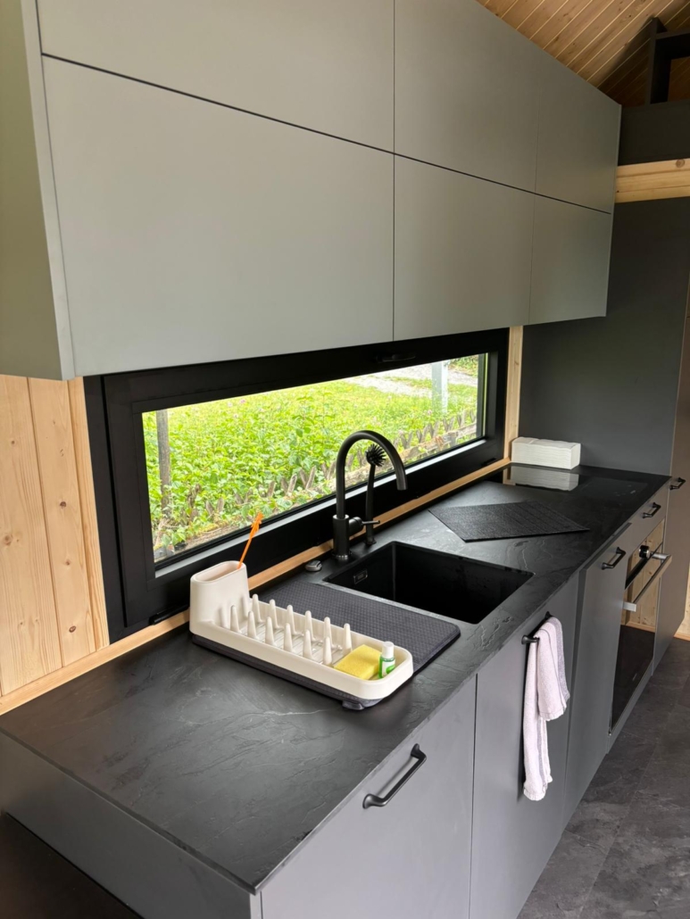 - Voll ausgestattete Küche mit Induktionsherd, Spüle, Backofen & großem Fenster mit Blick ins Grüne