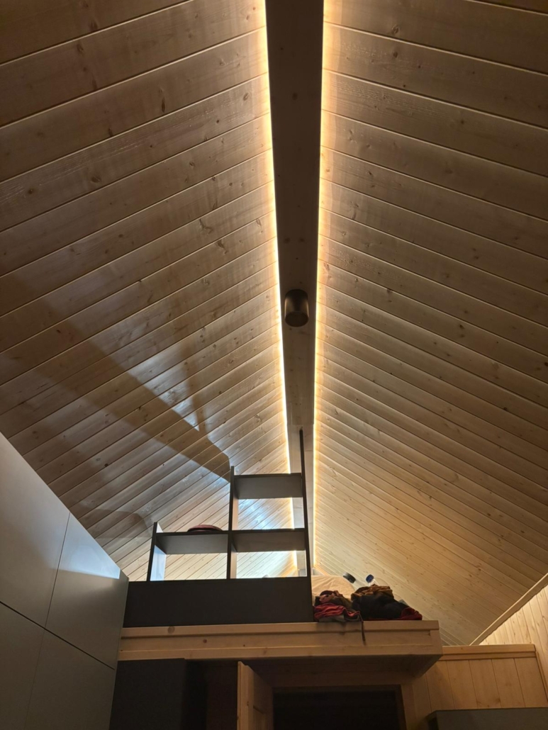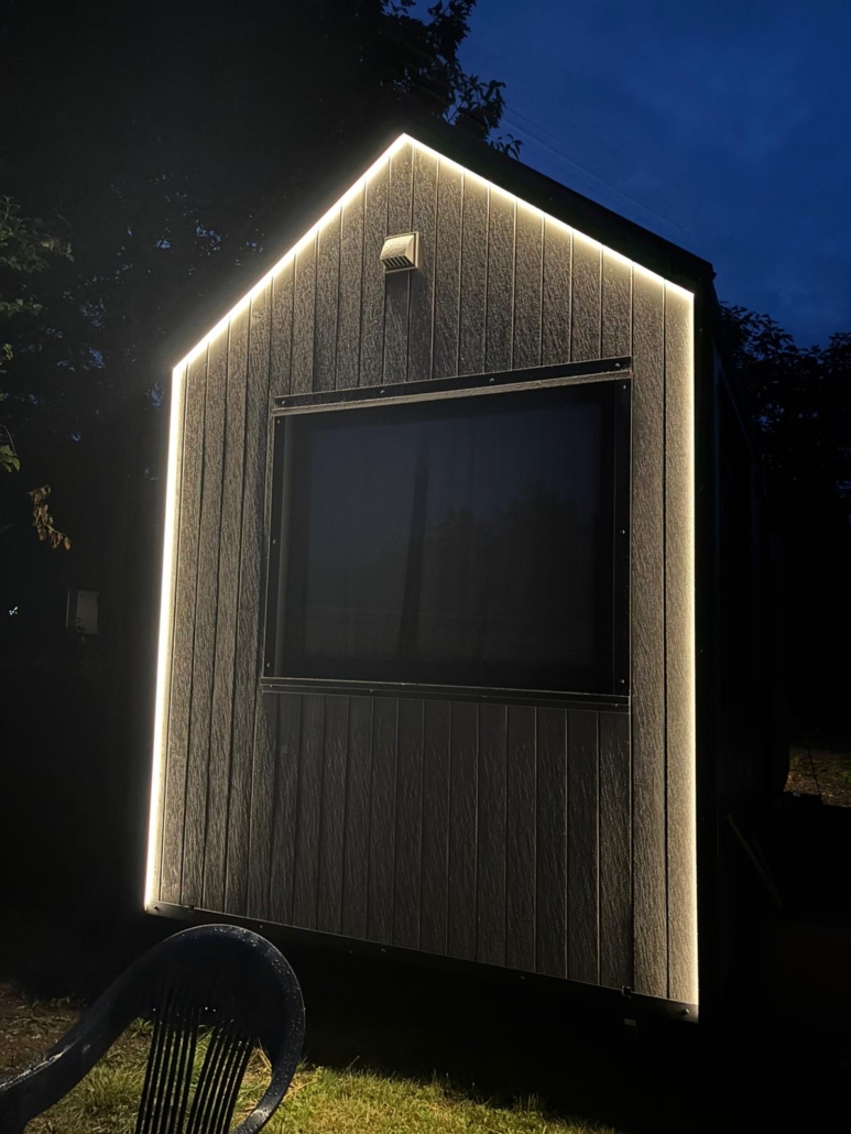 Besonders stimmungsvoll: Die LED-Beleuchtung am Tinyhouse sorgt abends für eine wunderschöne Atmosphäre – ob beim Glas Wein im Garten oder beim Blick aus dem Fenster.