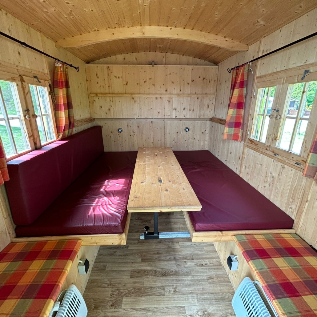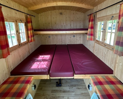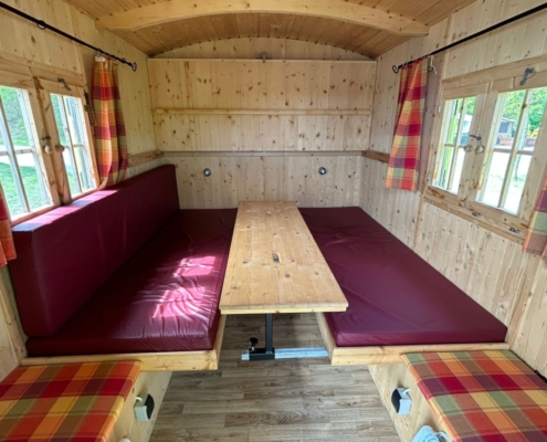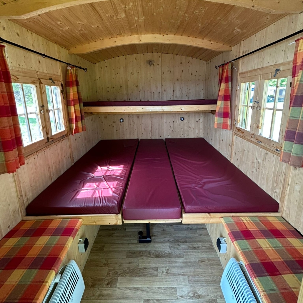 Unsere Schäferwagen sind wahre Raumwunder und bieten ein einzigartiges Übernachtungserlebnis. Ob als romantischer Rückzugsort zu zweit oder als praktisches Basislager – hier genießt du die Natur ganz intensiv.